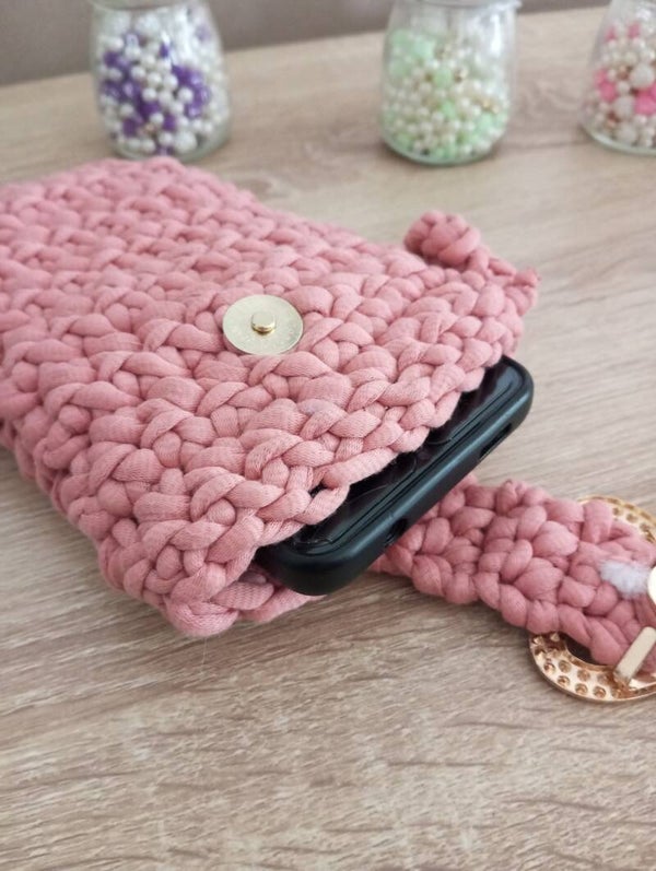 pochette pour portable crocheté en maille polyester rose petit cœur environ 4 cm avec strass et pompon couleur or