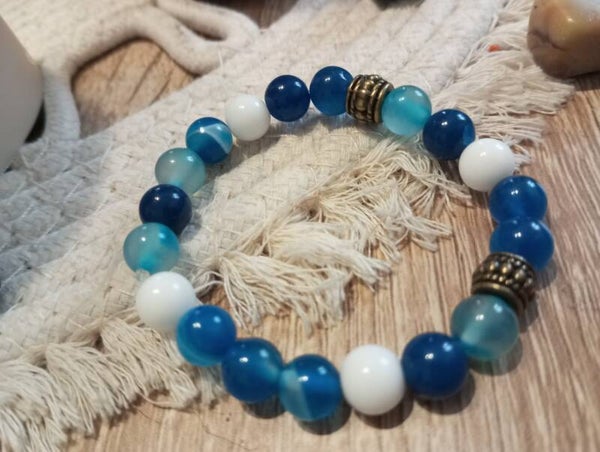 Laissez-vous envelopper par l’énergie douce et bienveillante de ce bracelet que j’ai créé avec amour et intention. Chaque perle d’agate à rayures bleu océan et d’agate blanche a été choisie avec soin, puis assemblée à la main, infusée de mes énergies positives pour vous accompagner au quotidien.